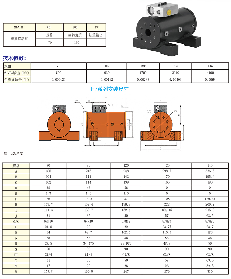 F7系列螺旋擺動(dòng)油缸為底腳式安裝,帶防暴管平衡閥,結(jié)構(gòu)緊湊,外觀合適。安裝方便,普遍應(yīng)用于各種工程機(jī)械及翻轉(zhuǎn)機(jī)構(gòu),與進(jìn)品F7系列1:1互換使用。